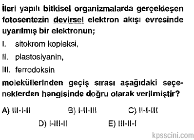 uyarılmış bir elektron ferrodoksin, sitokrom kompleksi ve plastosiyaninden geçerek fotosistem ı’e tekrar ulaşır. CEVAP: A