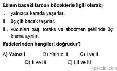 Böcekler, karada ve tatlı sularda bulunurlar. Vücutları baş, toraks ve abdomen olarak tanınabilir bölümlere ayrılır.Üç çift bacaklara ve bir çift antene sahip olup çoğu iki çift kanat taşırlar. CEVAP: D