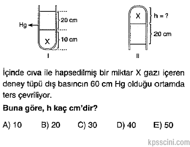 Bu soru tipinde basınç X hacim durumunu sabit kaldığı bilinmelidir. P = 60 - 20 = 40 cm CEVAP: B
